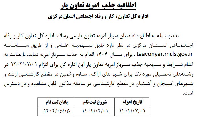 اطلاعیه جذب امریه تعاون یار ۱۱ تیر ۱۴۰۴ | ۱۲:۰۴ کد : ۵۲۷۴۸ اطلاعیه ارسال به دیگران نام شما ایمیل شما ایمیل دریافتکننده ارسال انصراف تعداد بازدید:۸۴۶ اطلاعیه جذب امریه تعاون یار