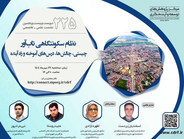 دویست و بیست و پنجمین نشست علمی - تخصصی مرکز پژوهش های توسعه و آینده نگری، تحت عنوان نظام سکونتگاهی تاب آور، چیستی، چالش ها، درس های آموخته و راه آینده به صورت مجازی برگزار می شود.