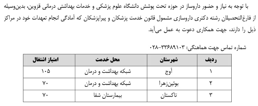 جذب نیروی داروساز مشمول قانون خدمت ۲۵ آذر ۱۴۰۴ | ۰۹:۰۰ کد : ۵۷۰۵۷ اطلاعیه ارسال به دیگران نام شما ایمیل شما ایمیل دریافتکننده ارسال انصراف تعداد بازدید:۱۹۶۷ جذب نیروی داروساز مشمول قانون خدمت در دانشگاه علوم پزشکی قزوین