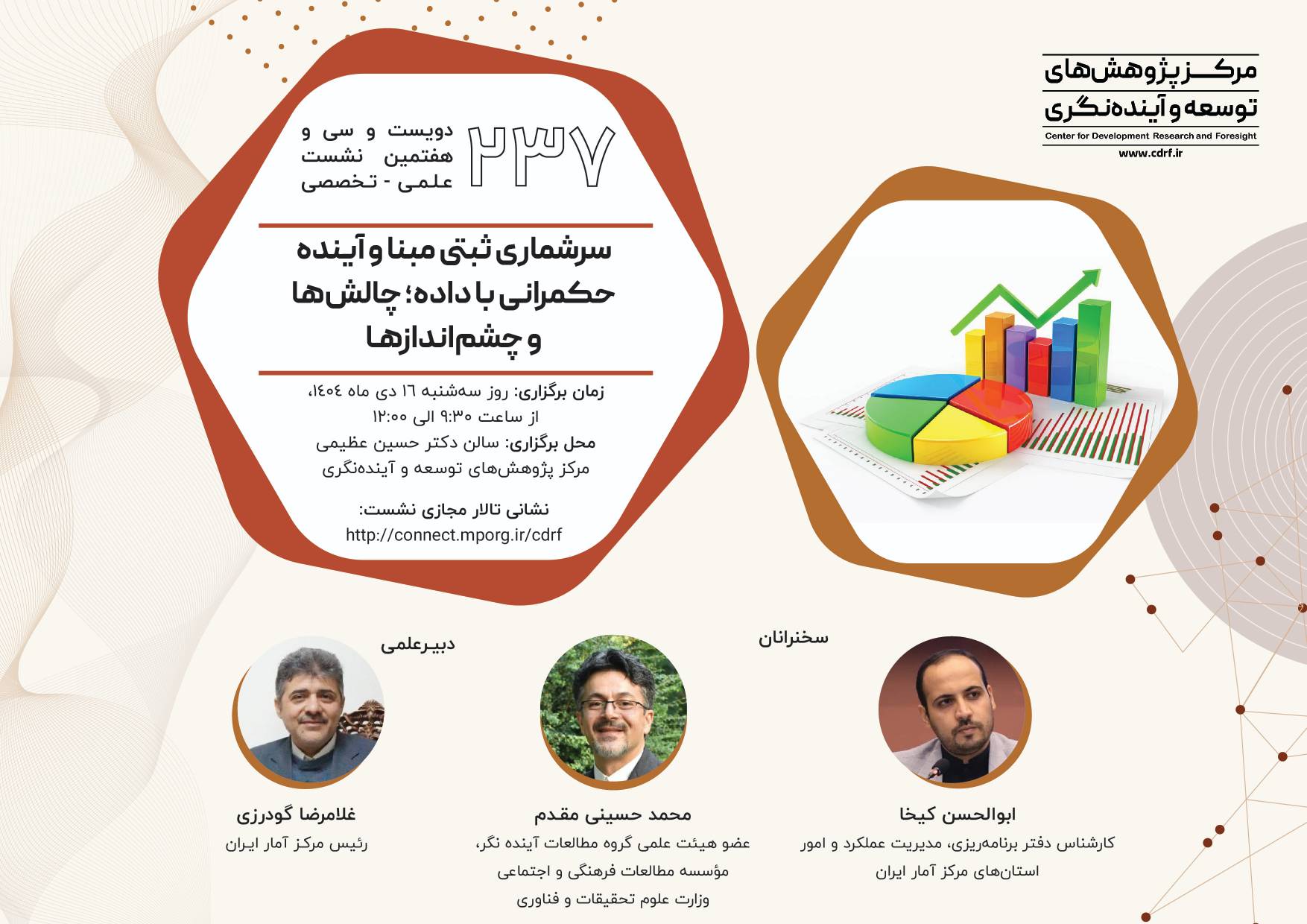 نشست علمی سرشماری ثبتی مبنا آینده حکمرانی با داده ۱۴ دی ۱۴۰۴ | ۱۰:۲۱ کد : ۵۷۴۱۸ اطلاعیه ارسال به دیگران نام شما ایمیل شما ایمیل دریافتکننده ارسال انصراف تعداد بازدید:۵۸۲ دویست وسی وهفتمین نشست علمی - تخصصی با عنوان سرشماری ثبتی مبنا آینده حکمرانی با داده، چالش ها وچشم اندازها