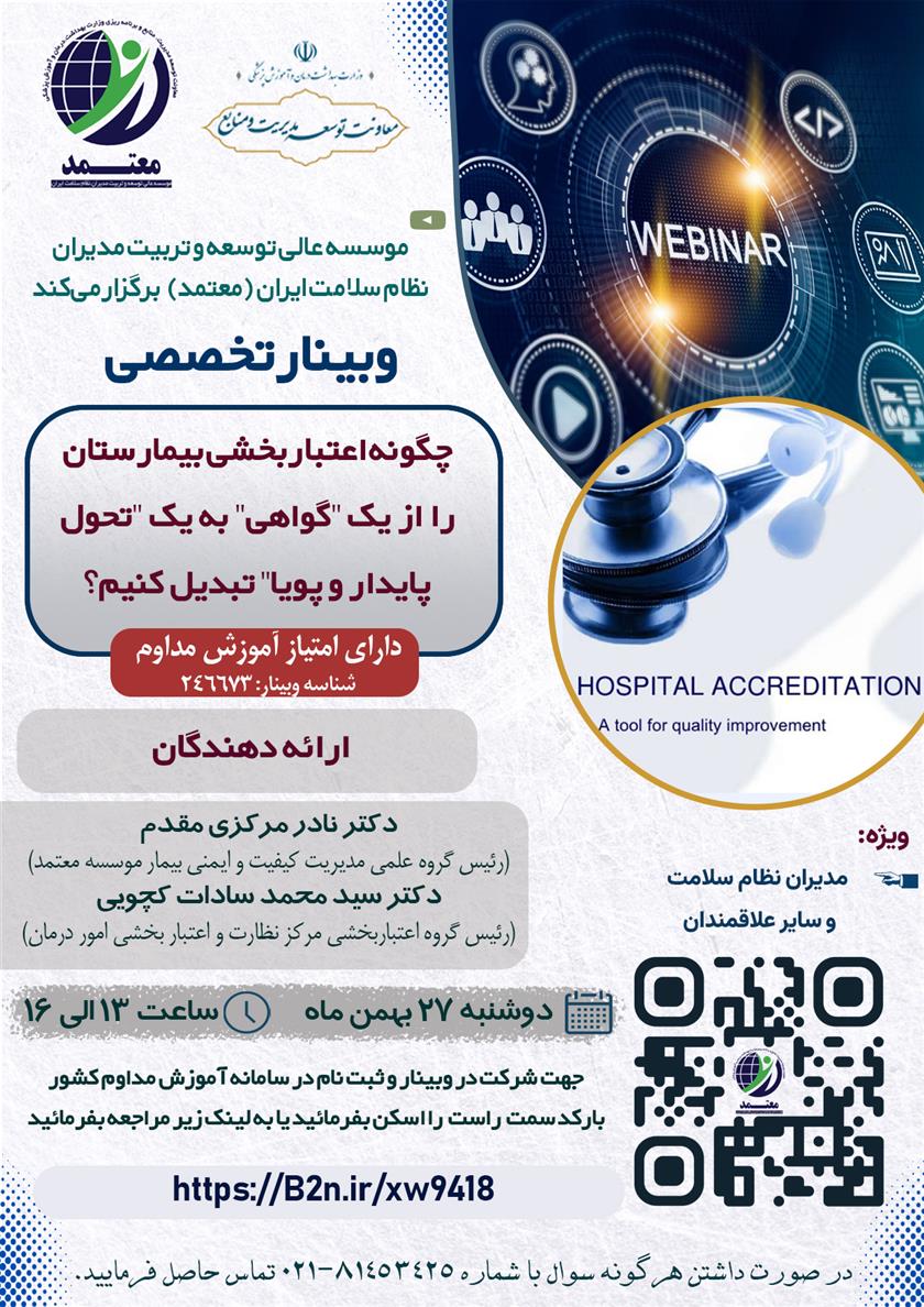 وبینار تخصصی "چگونه اعتباربخشی بیمارستان را از یک "گواهی" به یک "تحول پایدار و پویا" تبدیل کنیم؟ ۲۶ بهمن ۱۴۰۴ | ۱۲:۱۴ کد : ۵۸۰۱۱ اطلاعیه ارسال به دیگران نام شما ایمیل شما ایمیل دریافتکننده ارسال انصراف تعداد بازدید:۹۲ برگزاری وبینار تخصصی "چگونه اعتباربخشی بیمارستان را از یک " گواهی" به یک " تحول پایدار و پویا " تبدیل کنیم؟